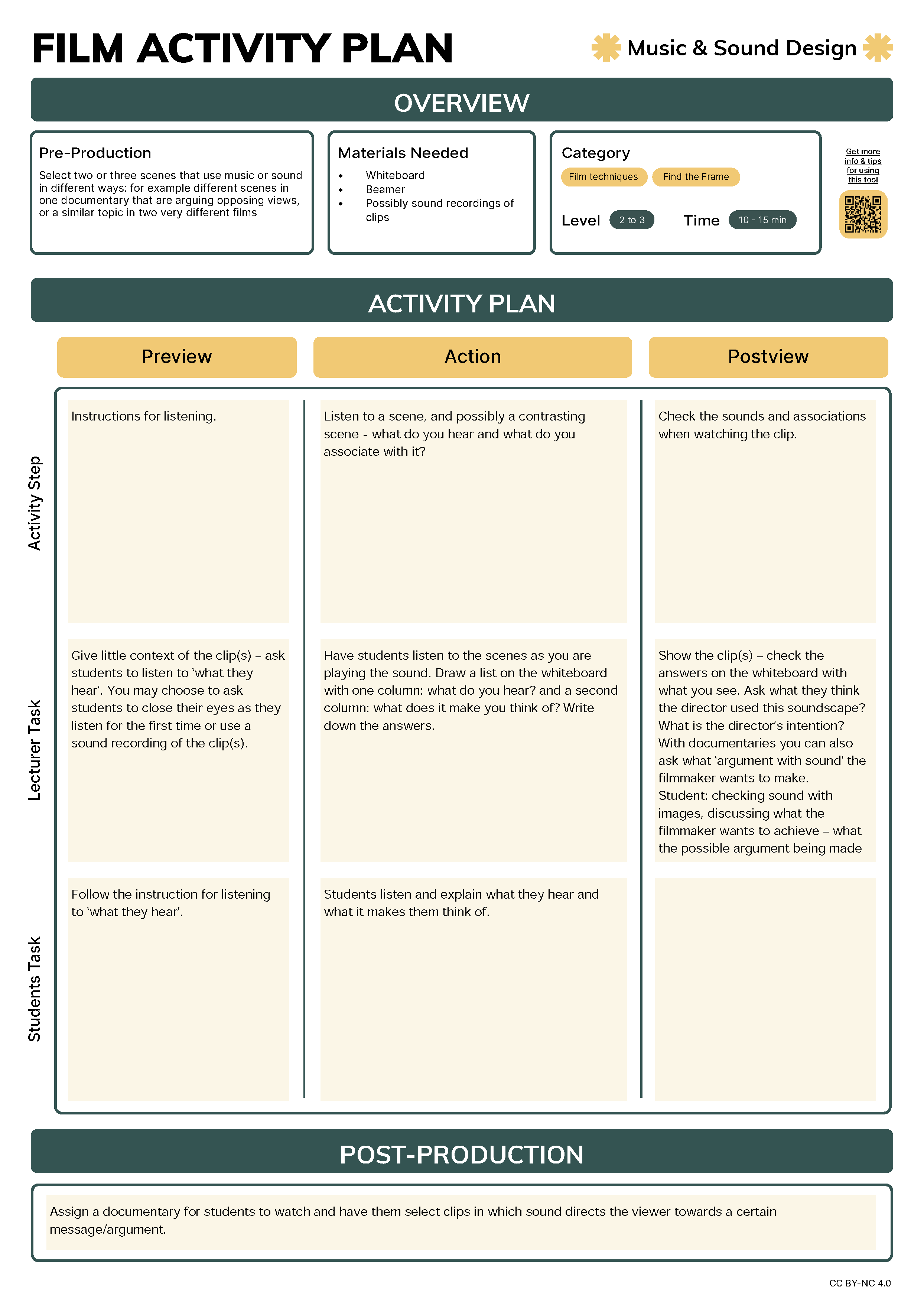Sound in film is added very consciously. When a film is building up to a big reveal, it might use suspenseful music. When it wants to appeal to your emotions, you might get sad music. Sometimes a voice-over is used with certain images, even though the person whose voice it is was also filmed for a talking-head shot. Why? What made the filmmaker decide that a voice-over would be more effective? What are they trying to achieve? And what other sounds are added to the documentary for impact?